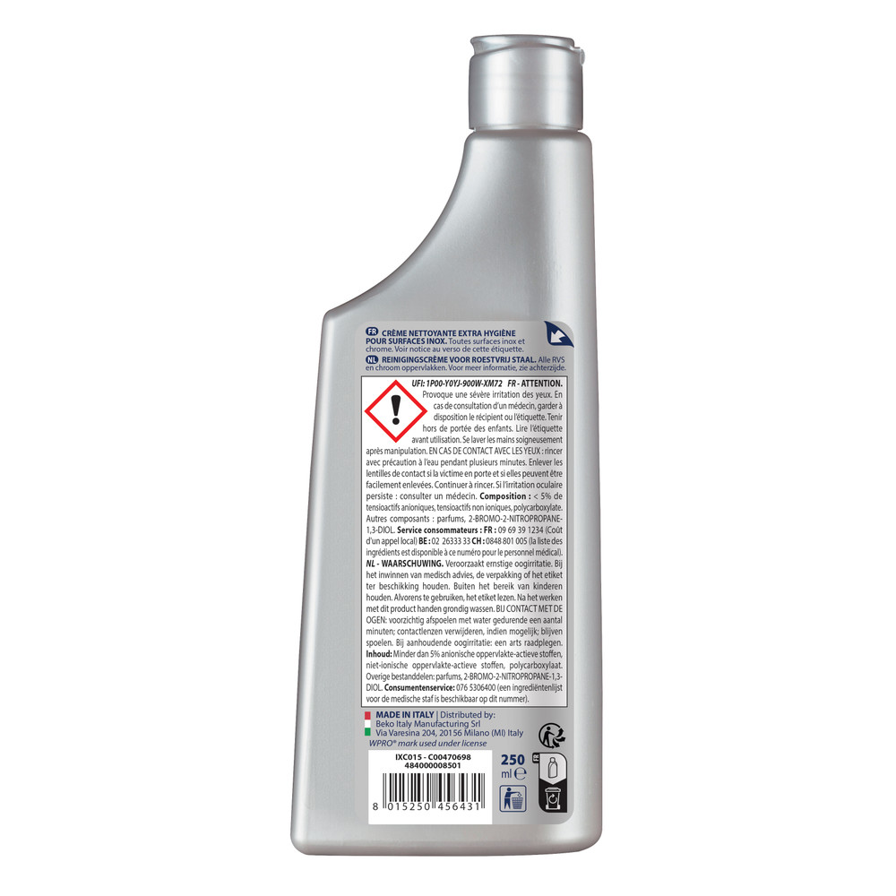 La crème nettoyante inox nettoie efficacement, protège et fait briller les surfaces inox et chrome tout en laissant un film protecteur antitraces et résistant à l’eau. Laisse une agréable odeur de citron.