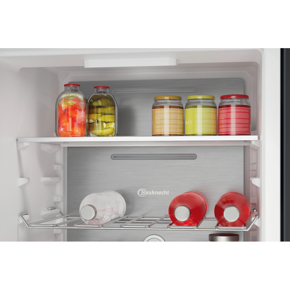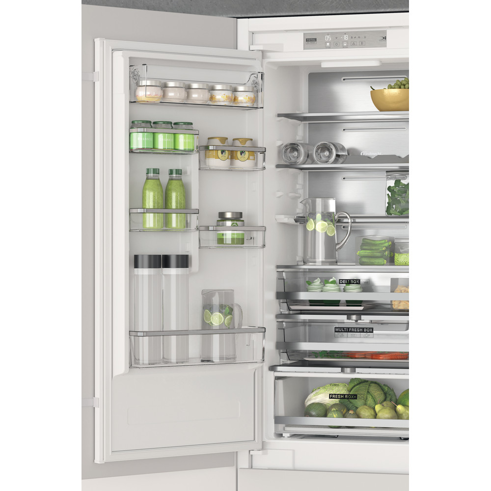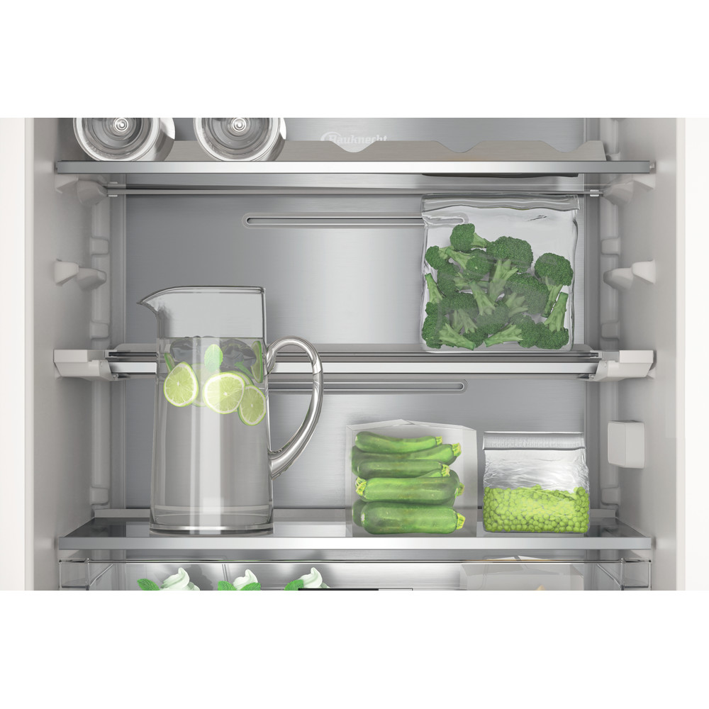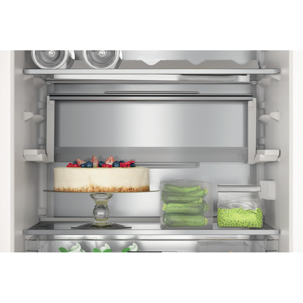 Ce réfrigérateur combiné intégrable Bauknecht présente les caractéristiques suivantes : ventilateur produisant un flux dair doux et régulier à l'intérieur de l'appareil pour une meilleure aération. Appareil de grande taille pour répondre aux besoins de toute la famille. Chaque fois que vous ouvrez la porte de votre réfrigérateur, la technologie Active Fresh active rapidement le compresseur pour restaurer la température idéale à l’intérieur de la cavité, afin qu’elle reste constante en toutes circonstances. Partie surgélation en bas. Mode vacances réduisant la consommation d'énergie en votre absence. Étagères en verre élégantes et robustes. Balconnet pratique pour y placer vos bouteilles en toute sécurité. Couleur: blanc.